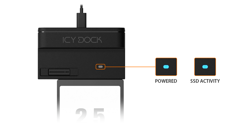 Ensure the connected USB port works properly and the hard drive/SSD and connector are plugged in and secured. Test the device with other USB ports if the power light is still off. If the LED lights up, but the system does not detect the drive, refer to Scenario 2. If the problem occurs through other working USB ports, please contact our customer service via tech@icydock.com.