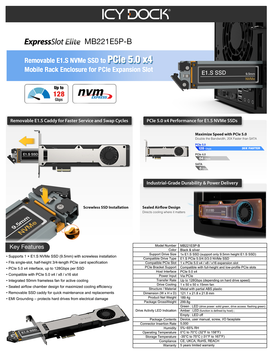 | Compatible Drive Type: | E1.S PCIe 5.0/4.0/3.0 NVMe SSD |