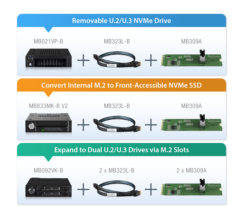 The MB309A is a key part of ICY DOCK’s EXLink ecosystem, designed to simplify the deployment of removable NVMe SSD solutions. Whether you're upgrading a single M.2 slot, building a front-access U.2 configuration, or expanding dual-drive capacity, MB309A works seamlessly with ICY DOCK’s mobile racks and SlimSAS cables to deliver a turnkey setup.
