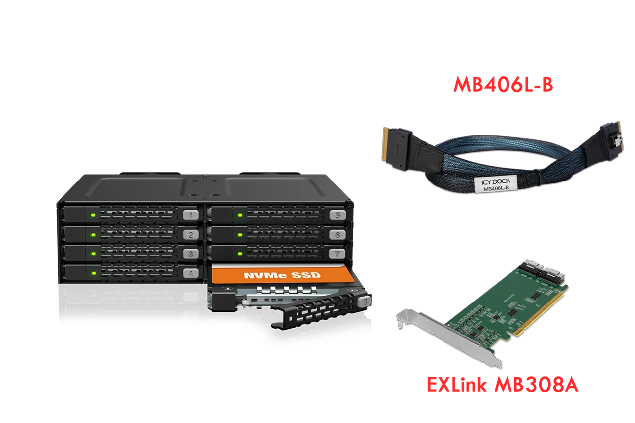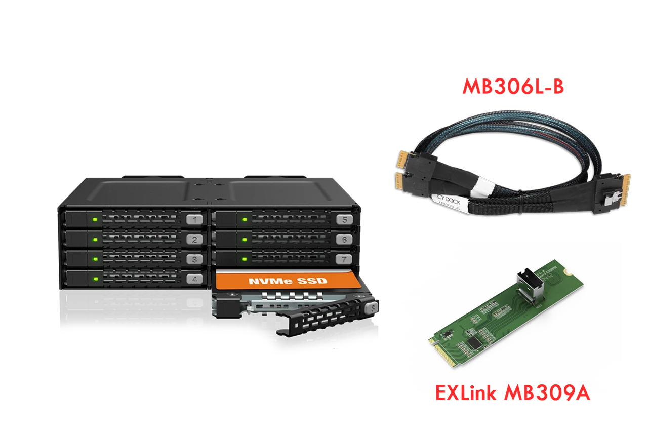 | • | Fits 8× 7mm U.2/U.3 NVMe SSDs into a single external 5.25" device bay |