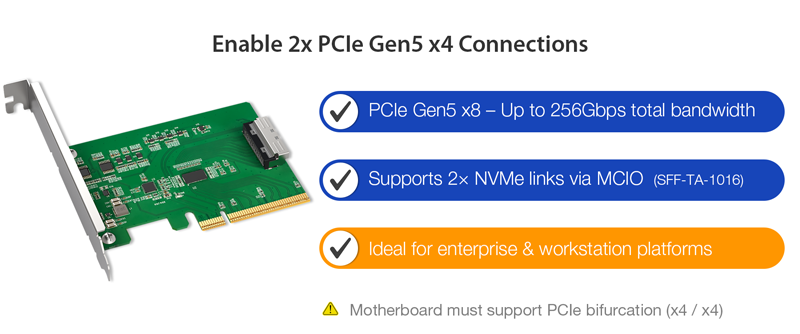 | • | Requires motherboard PCIe bifurcation (x4, x4) to access two SSDs (This adapter card itself does not perform bifurcation) |